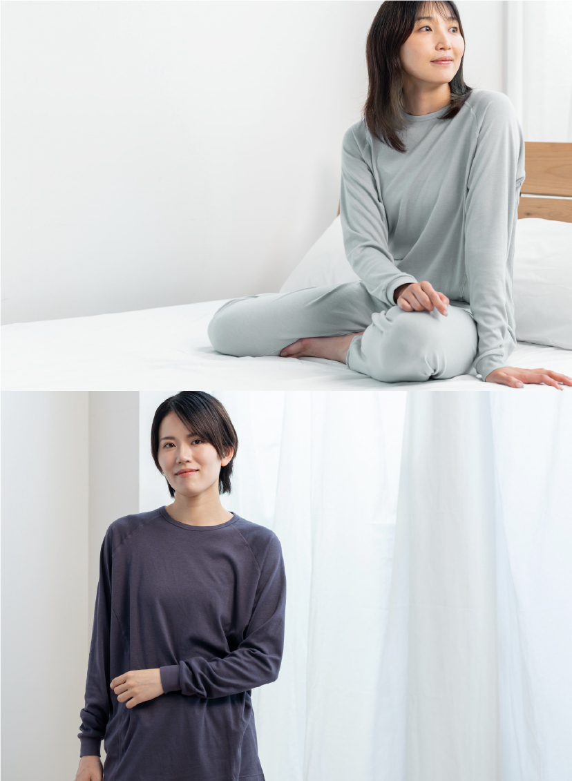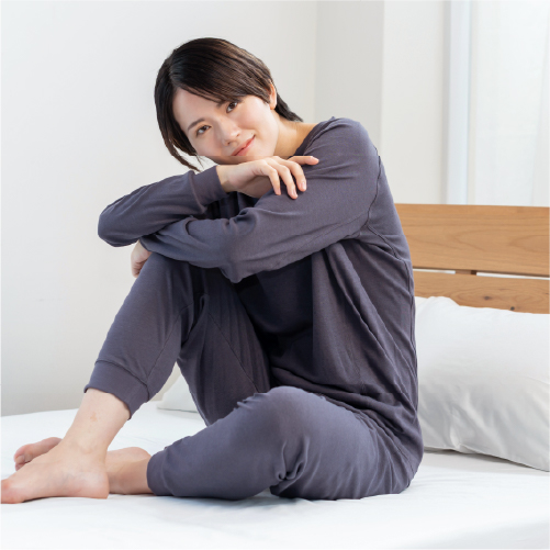 独自の3Dパネル構造で寝返り時の圧を約70%軽減し、身体への負担を抑制。富士山みくりや溶岩™練り込みの「Renew Tex™」が遠赤外線を反射し、血行を促進します。さらに袖・ボトムスを長めにゆったり設計していることで、手先・足先の冷えも和らげ、快適な睡眠環境を支えます。