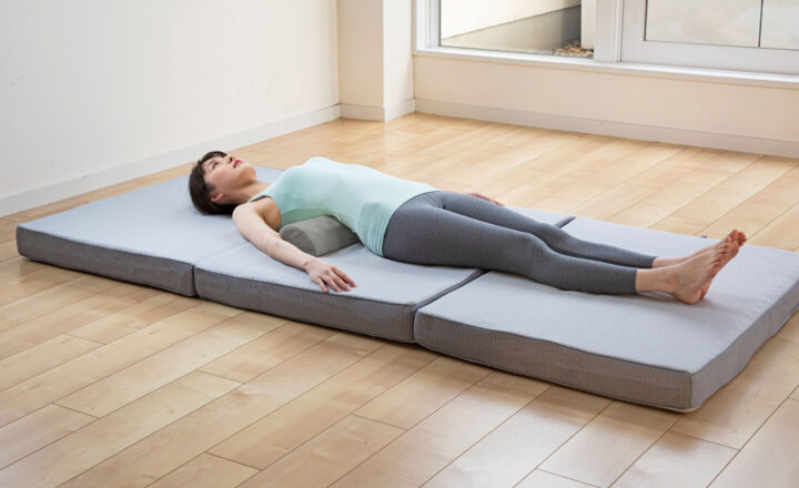 入眠前のリラックスタイムにストレッチエコーまくらで軽いストレッチ運動はいかがですか?筋肉のコリをほぐしゆったり、スッキリ、リラックスを。